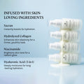 Aqua, Glycerine, Dimethicone, Phenyl Trimethicone, Niacinamide, Xylitylglucoside, Anhydroxylitol, Xylitol, Polyglyceryl-3 Methylglucose Distearate, Diisostearyl Malate, C15-19 Alkane, glyceryl glucoside, Hydroxyethyl Urea, Betaine, Phenoxyethanol, Benzyl Alcohol, Triethylene Glycol, Silica, PEG-40 Hydrogenated Castor Oil, Polyacrylate-13, Polyisobutene, Polysorbate 20, Aphanothece Sacrum Polysaccharide, Hydrolyzed Collagen, Sodium Hyaluronate Crosspolymer,Sodium Hyaluronate, Hydrolyzed Sodium Hyaluronate, Hyaluronic Acid, Hydrolyzed Hyaluronic Acid, Sodium Acetylated Hyaluronate, Hydrolyzed Glycosaminoglycans,Sodium Acrylates Copolymer, Lecithin, Sodium Polyglutamate, Fragrance, Disodium EDTA
