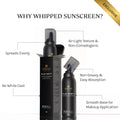 Whipped sunscreen provides a smoother base for a comfortable feel on the skin. It spreads easily, absorbs quickly, and requires a minimal amount to cover a large area.